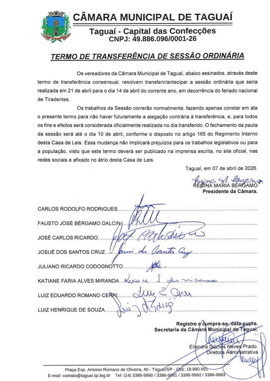A Câmara Municipal de Taguaí informa que a Sessão Ordinária inicialmente prevista para o dia 21 de abril de 2026 foi transferida para o dia 14 de abril de 2026, em decisão consensual dos vereadores.